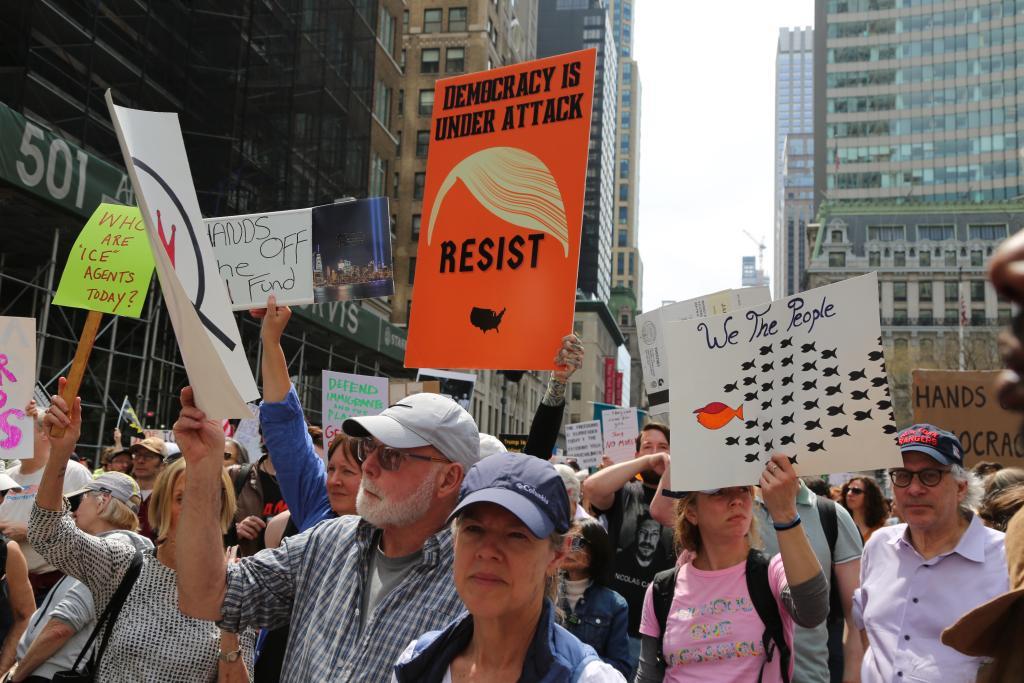 4月19日,人們?cè)诿绹?guó)紐約街頭參加抗議活動(dòng)。美國(guó)多地19日舉行抗議活動(dòng),首都華盛頓、紐約、舊金山、波士頓等城市的民眾走上街頭,抗議現(xiàn)政府大規(guī)模裁員、加征關(guān)稅、驅(qū)逐移民等政策。新華社記者劉亞南攝