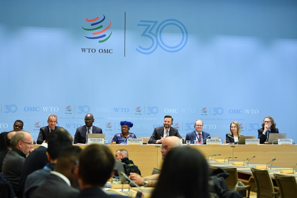 4月16日,在瑞士日內(nèi)瓦世界貿(mào)易組織總部,世貿(mào)組織總干事伊維拉(后排左四)出席新聞發(fā)布會(huì)。世界貿(mào)易組織16日發(fā)布的最新報(bào)告顯示,美國(guó)關(guān)稅政策導(dǎo)致全球貿(mào)易前景嚴(yán)重惡化。新華社記者連漪攝