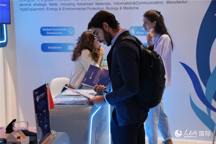 在2025年迪拜人工智能節(jié)上,一位參展人士在長三角國家技術(shù)創(chuàng)新中心展區(qū)了解中國科創(chuàng)企業(yè)介紹。人民網(wǎng)記者 張志文攝
