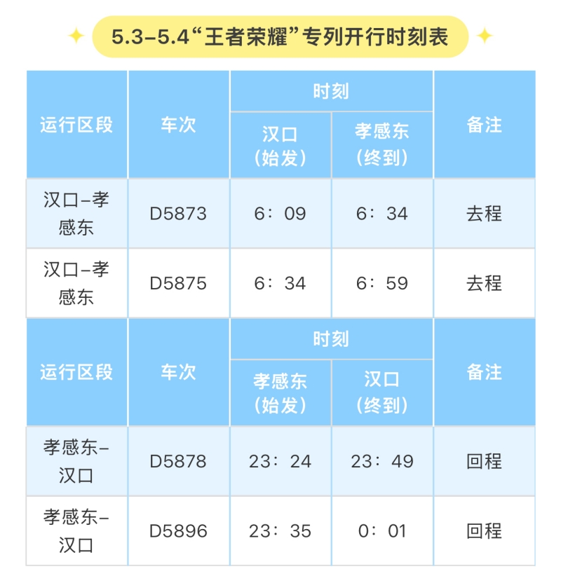 “王者榮耀專列”(5月3日和5月4日),每日安排四趟為您免費服務(wù),在漢口站、孝感東站、孝感奧體中心專列服務(wù)臺領(lǐng)取“王者榮耀專列乘車證”直接進出站乘車,數(shù)量有限,先到先得,送完為止!具體時刻表如下: