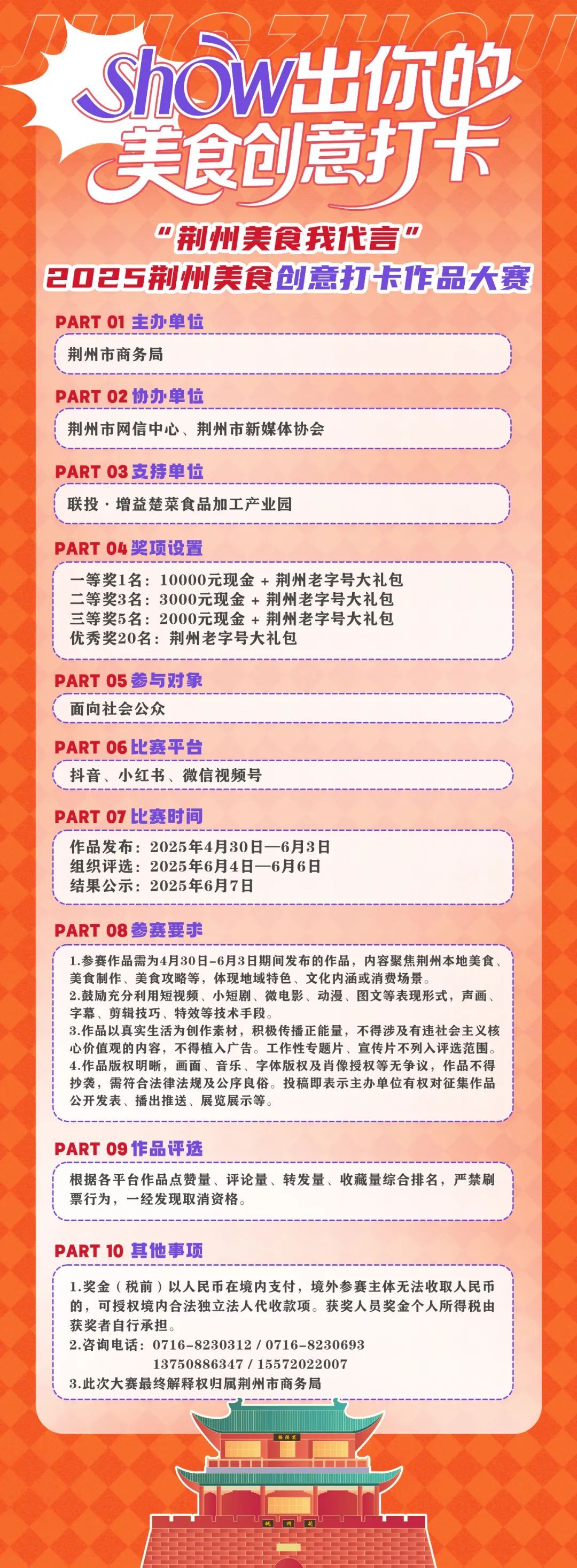 即日起至6月3日,由荊州市商務(wù)局主辦,荊州市網(wǎng)信中心、荊州市新媒體協(xié)會(huì)協(xié)辦的“荊州美食創(chuàng)意打卡作品大賽”火熱開(kāi)賽,萬(wàn)元現(xiàn)金大獎(jiǎng)、老字號(hào)大禮包直接“端上桌”——最高10000元現(xiàn)金+荊州老字號(hào)大禮包等你來(lái)贏!