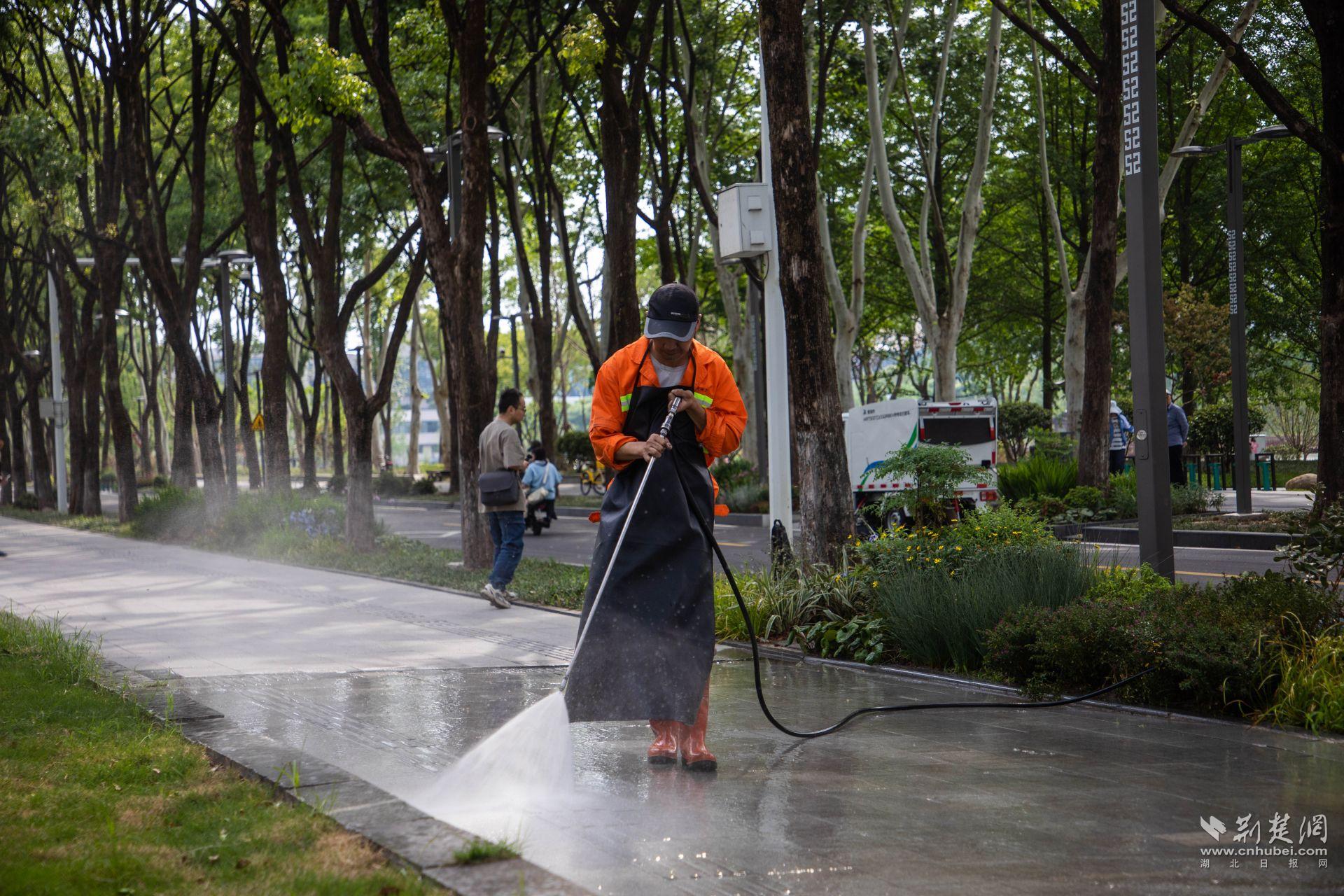 夜幕下的沿江大道,江岸環(huán)衛(wèi)黎黃陂路班組長正在逐塊沖洗人行道地磚。班組長占冬晴介紹說,“沿著漢口江灘,從山海關(guān)路到黎黃陂路再到江漢關(guān),都是最受年輕游客喜愛的地方,他們在這里拍的每一張打卡照,都是展示城市文明的窗口,我們不能有半點馬虎。”