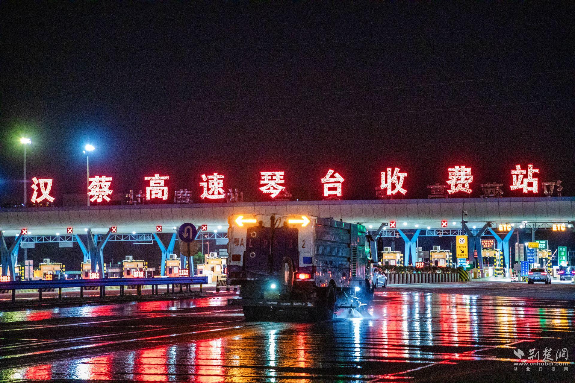 29日夜晚11時許,在漢陽漢蔡高速進出城口,高壓清洗車、吸掃車、隔音屏清洗車等10余臺機械作業(yè)裝備待發(fā)。