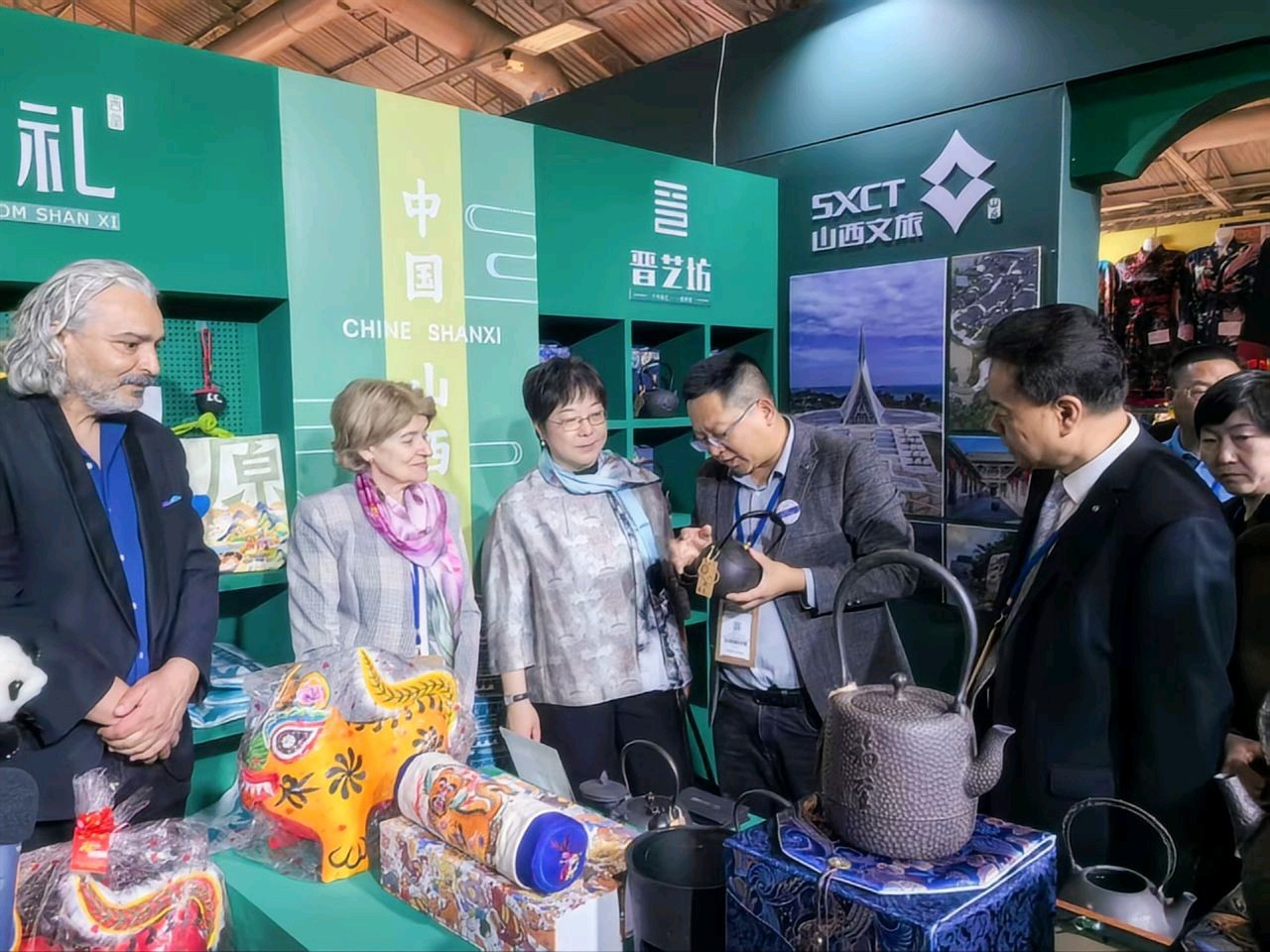 中國常駐聯(lián)合國教科文組織代表楊新育、聯(lián)合國教科文組織原總干事伊琳娜·博科娃到晉藝坊展位