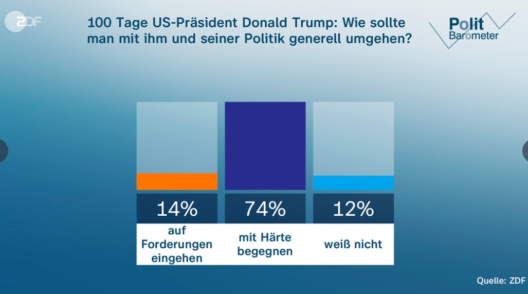 根據(jù)這項(xiàng)調(diào)查,大多數(shù)受訪者認(rèn)為德國經(jīng)濟(jì)正在走下坡路,幾乎沒有人對(duì)近期經(jīng)濟(jì)復(fù)蘇抱有希望,而美國總統(tǒng)特朗普采取的加征關(guān)稅等措施更是進(jìn)一步加劇了德國經(jīng)濟(jì)壓力。在此背景下,74%的受訪者明確表示,德國政府在對(duì)美政策上應(yīng)“更加強(qiáng)硬”,只有14%的人認(rèn)為應(yīng)對(duì)美作出妥協(xié)。