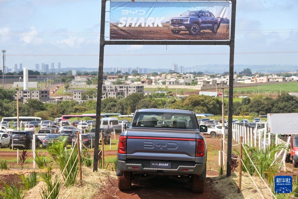 4月29日,在巴西圣保羅州里貝朗普雷圖市舉行的2025年巴西農(nóng)業(yè)科技展上,一輛比亞迪皮卡進(jìn)行越野演示。新華社記者 陳昊佺 攝