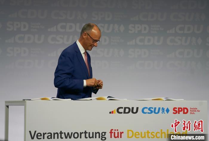 當?shù)貢r間5月5日,聯(lián)盟黨總理候選人弗里德里?!つ脑诎亓趾炇鹇?lián)合執(zhí)政協(xié)議。中新社記者 馬秀秀 攝