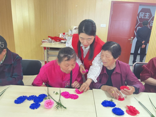 ??長者們自豪地展示作品,粉紅、藍色、紅色的康乃馨肥皂花栩栩如生,現(xiàn)場洋溢著成就感和歡聲笑語。