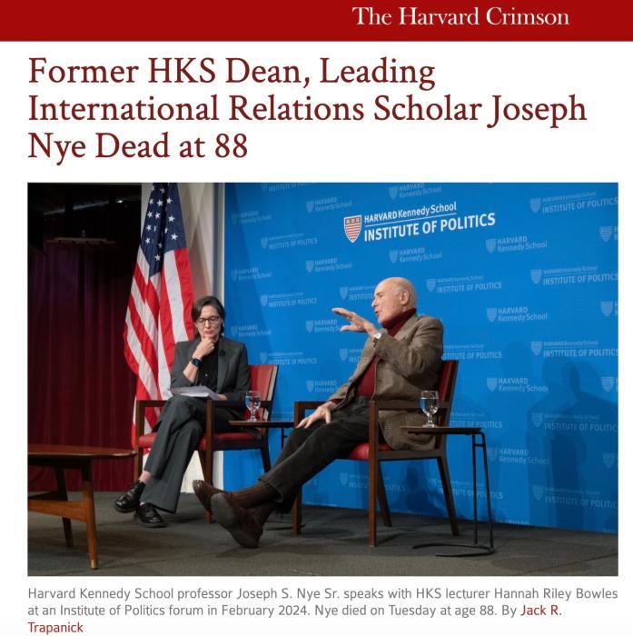 報道稱,7日下午,哈佛大學(xué)肯尼迪政府學(xué)院院長杰里米·溫斯坦在給教職員工和學(xué)生的電子郵件中宣布了約瑟夫·奈去世的消息。