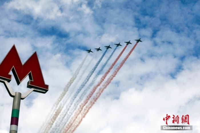 資料圖:當(dāng)?shù)貢r間5月7日,紀(jì)念蘇聯(lián)偉大衛(wèi)國戰(zhàn)爭勝利80周年閱兵式總彩排在俄羅斯首都莫斯科舉行,這也是5月9日紅場閱兵式前的最后一次彩排。圖為戰(zhàn)機(jī)編隊(duì)飛過莫斯科上空。中新社記者 田冰 攝