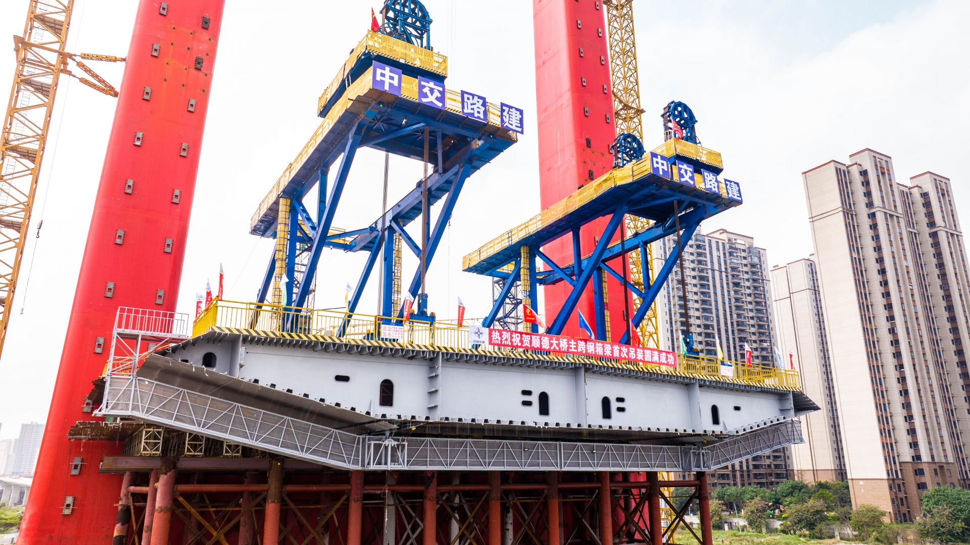 順德大橋索塔為罕見的鋼混組合子母塔型式,其中容桂側索塔高204米,大良側索塔高151米。全橋共計112個鋼塔節(jié)段,最大節(jié)段重量達250噸,最大吊高達200米。單個索塔設計3道橫梁,中、上橫梁采用純鋼結構,高塔橫梁采用5米(寬)×5米(高)“回”字形設計,上橫梁長33米,中橫梁長36.14米。上橫梁最大吊裝高度為196米,最大吊裝重量達到482噸。由于高塔處于容桂水道百余米外的陸地上,無法采用大噸位浮吊吊裝方案,200米的吊高也讓所有履帶吊設備力不從心,而國內滿足吊裝條件的塔吊保有量少、檔期緊、租金高。此外,鋼橫梁吊裝重量大,常規(guī)工藝需通過分節(jié)段吊裝后高空散拼,安全風險大。頗高難度的鋼塔節(jié)段及橫梁吊裝,給全體建設者帶來巨大挑戰(zhàn)。