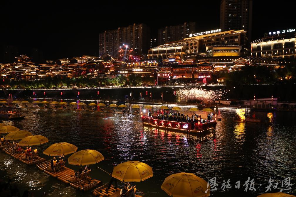 夜幕低垂,宣恩貢水河泛起碎金波光。4月27日,60余位嘉賓乘竹筏體驗(yàn)“龍游貢水”項(xiàng)目,土苗文化在槳聲燈影中次第蘇醒。竹篙輕點(diǎn)間,龍船調(diào)的悠長(zhǎng)歌聲穿透薄霧。