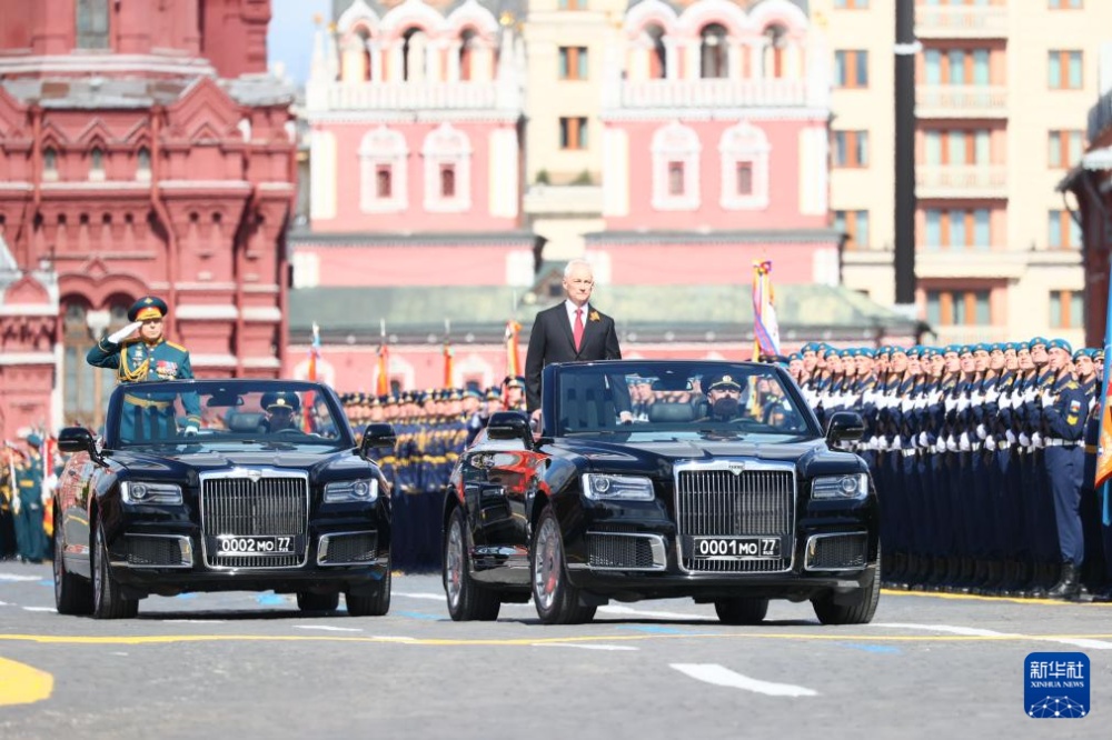 5月9日,在俄羅斯首都莫斯科,俄羅斯國(guó)防部長(zhǎng)別洛烏索夫(前右)在紀(jì)念蘇聯(lián)偉大衛(wèi)國(guó)戰(zhàn)爭(zhēng)勝利80周年閱兵式上檢閱部隊(duì)。