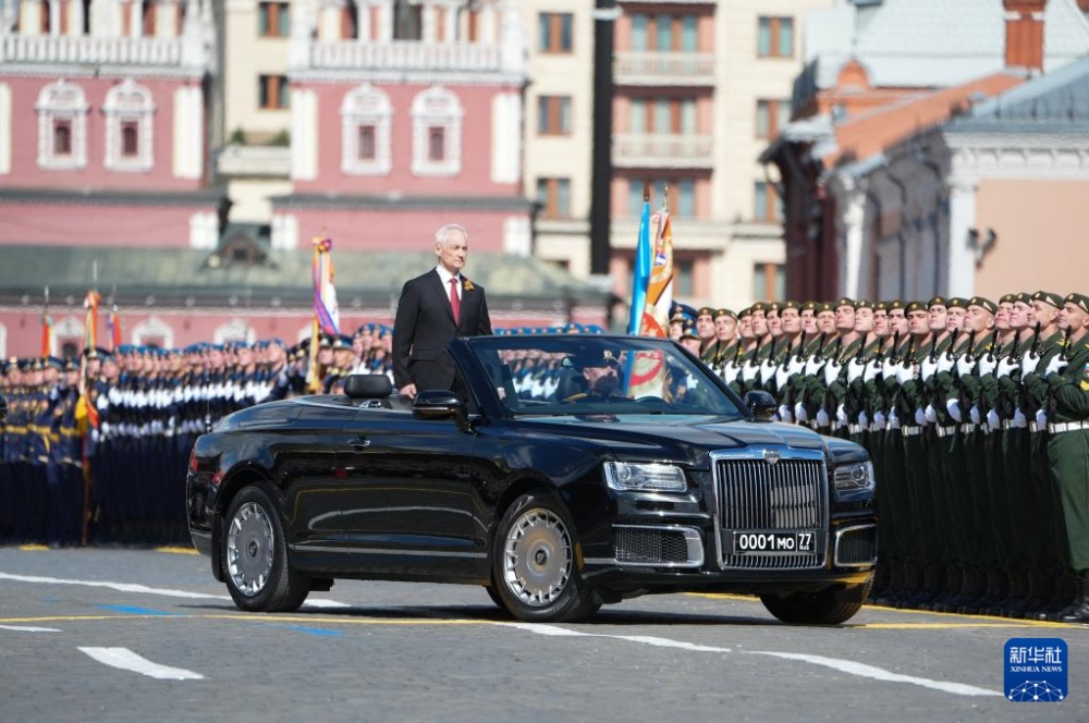 5月9日,在俄羅斯首都莫斯科,俄羅斯國(guó)防部長(zhǎng)別洛烏索夫(中)在紀(jì)念蘇聯(lián)偉大衛(wèi)國(guó)戰(zhàn)爭(zhēng)勝利80周年閱兵式上檢閱部隊(duì)。