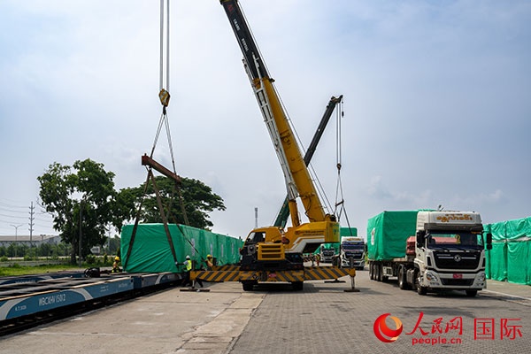 當(dāng)?shù)毓と擞没疖?chē)裝載援緬第十三批緊急人道主義地震救災(zāi)物資運(yùn)往災(zāi)區(qū)。人民網(wǎng)記者 謝佳君攝