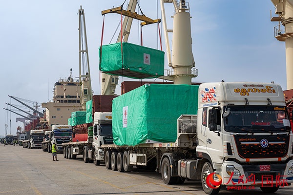 當(dāng)?shù)毓と嗽诟劭趶呢涊喩闲遁d援緬第十三批緊急人道主義地震救災(zāi)物資。人民網(wǎng)記者 謝佳君攝