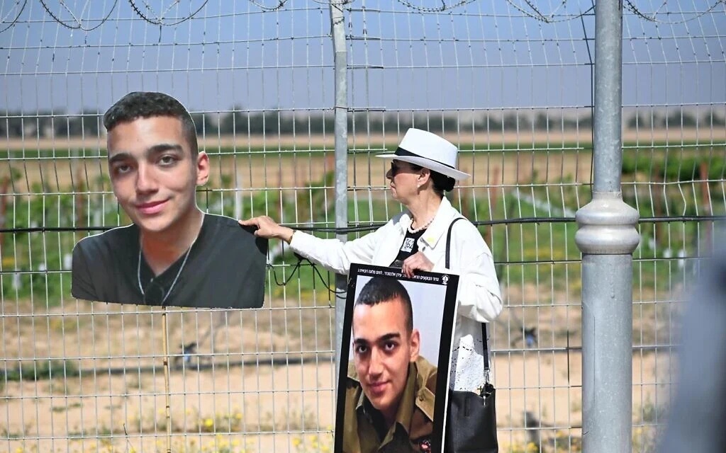 △2025年4月20日,艾丹·亞歷山大的祖母在加沙地帶邊境附近手捧被扣押的艾丹的照片。(來源:《以色列時(shí)報(bào)》)