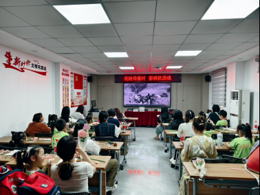 手工活動(dòng)結(jié)束后,社區(qū)組織親子家庭集體觀看經(jīng)典抗戰(zhàn)影片《地道戰(zhàn)》。當(dāng)銀幕上浮現(xiàn)冀中軍民智斗侵略者的場(chǎng)景時(shí),孩子們時(shí)而為巧妙戰(zhàn)術(shù)歡呼,時(shí)而因英雄犧牲攥緊母親的手。觀影后的互動(dòng)環(huán)節(jié)中,6歲的向瑩大聲說(shuō):“我要把今天做的花送給電影里的英雄媽媽!”