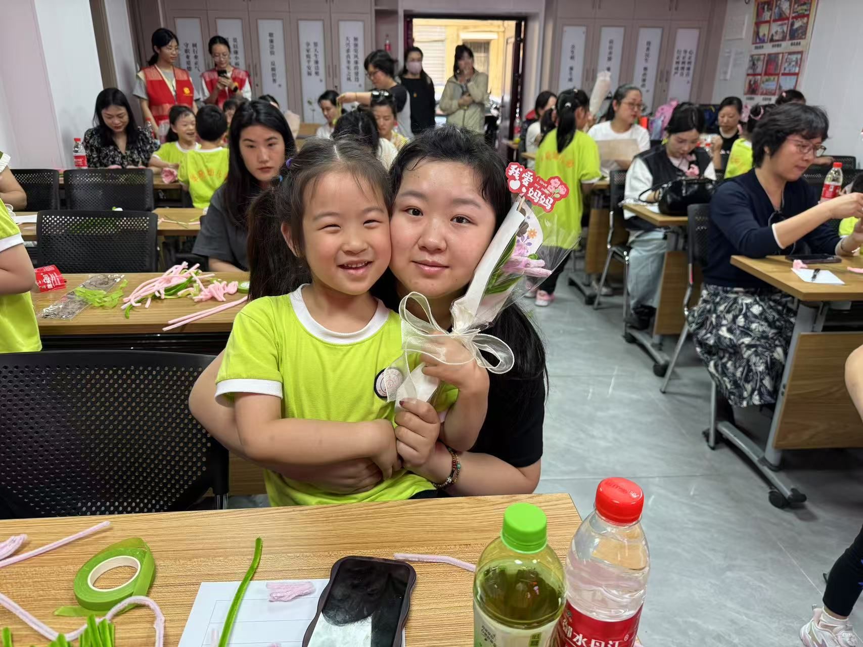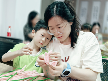 隨后的“扭扭棒郁金香”DIY將活動(dòng)推向高潮。在手工老師指導(dǎo)下,20組親子家庭默契配合——孩子們專注擰轉(zhuǎn)彩棒塑形花瓣,母親們細(xì)心捏造枝葉。一朵朵永不凋零的“郁金香”逐漸綻放,5歲的黃珊珊將花束獻(xiàn)給媽媽時(shí)說(shuō)道:“我要像郁金香保護(hù)花蕊一樣守護(hù)您!”