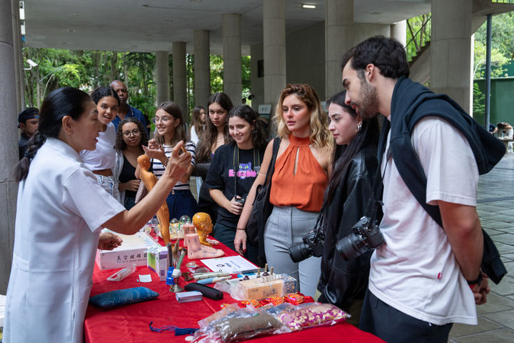 2025年4月15日,在巴西里約熱內(nèi)盧天主教大學舉辦的“國際中文日”慶?;顒由?,學生們觀看中醫(yī)療法展示。新華社記者 王天聰 攝