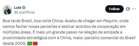 10日晚間,盧拉抵達(dá)北京后,在社交媒體上發(fā)文稱,將在此與中國在多個領(lǐng)域簽署合作協(xié)議,這是巴中兩國友好且戰(zhàn)略緊密關(guān)系的“又一重要進(jìn)展”。