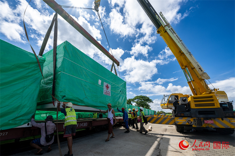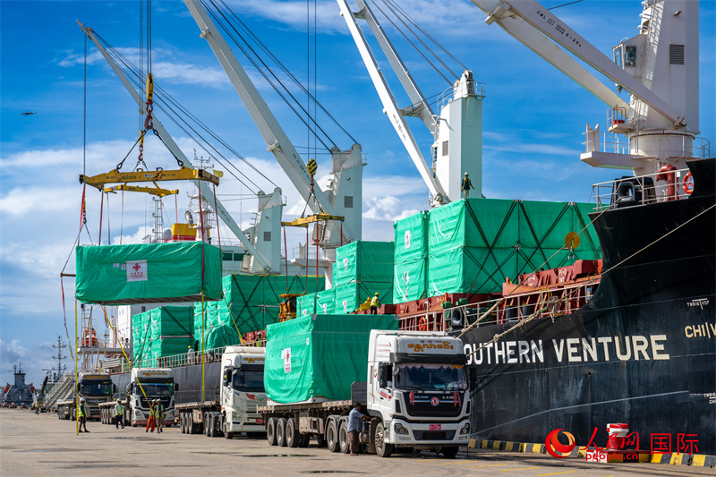 5月14日,當(dāng)?shù)毓と嗽诟劭趶呢涊喩闲遁d援緬第十四批緊急人道主義地震救災(zāi)物資。人民網(wǎng)記者 謝佳君攝