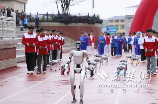 引人注目的巴東明德外國語學(xué)校小學(xué)部人工智能AI方隊,人形機器人引領(lǐng)著開幕式隊伍向前邁進,緊跟其后的15只機器狗時而步伐整齊、時而翻滾跳躍、時而站立鞠躬,靈動的身姿和活潑的模樣成為全場矚目的焦點。花繩跳、旗操表演、揮臂炫球技……機器人成為開幕式上一大亮點。