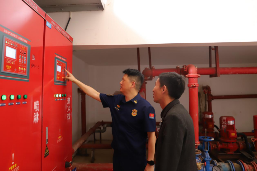 消防監(jiān)督員查看養(yǎng)老福利機構(gòu)消火栓泵運行情況。