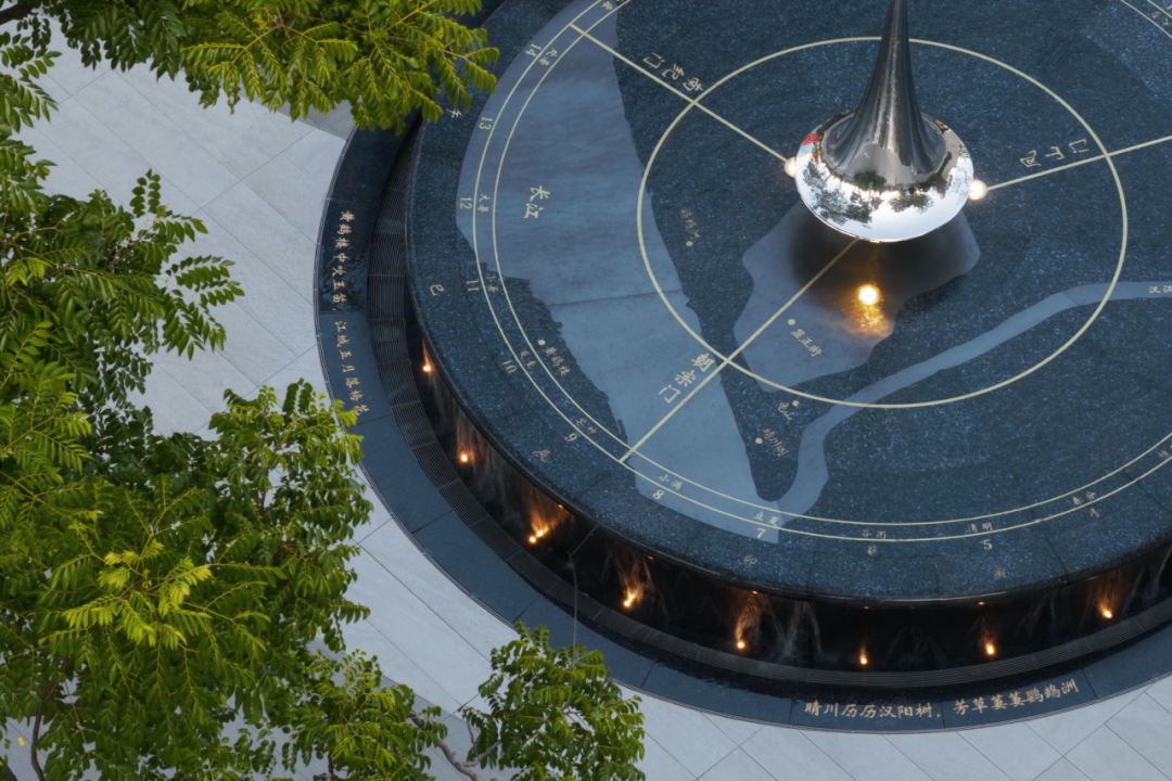 △「武漢之眼」入口廣場中心,擺放有精致的日晷藝術(shù)裝置。走進入口廣場中心,其精致的日晷藝術(shù)裝置與水景巧妙結(jié)合成為視覺焦點,可以從這些藝術(shù)裝置窺見漢陽的文化歷史。尤其是夜晚,水景被柔和的燈光照亮,如同夜空中最亮的星,為廣場增添了幾分夢幻與浪漫。