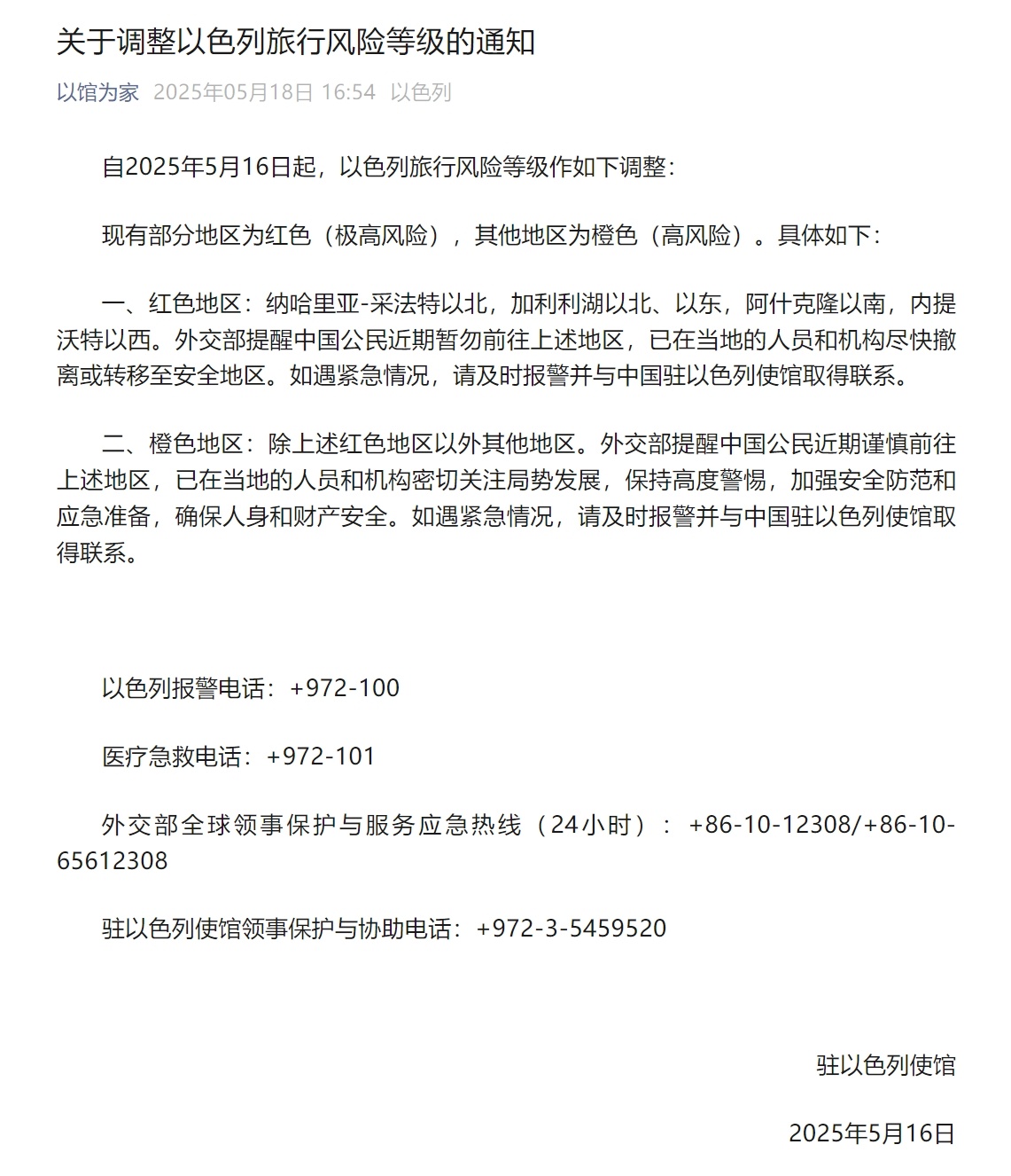 央視網(wǎng)消息:中國(guó)駐以色列大使館5月18日發(fā)布關(guān)于調(diào)整以色列旅行風(fēng)險(xiǎn)等級(jí)的通知。