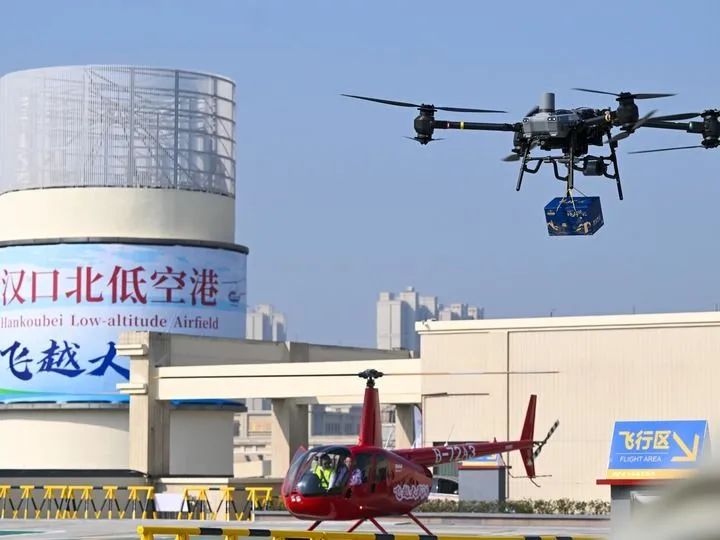 裝配快遞盒的無人機在漢口北低空港無人機停機坪起飛。新華社記者 肖藝九 攝