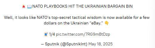 據(jù)報(bào)道,18日,俄羅斯衛(wèi)星通訊社在社交媒體平臺(tái)上發(fā)帖稱,看起來(lái)現(xiàn)在“花幾美元”,就能在億貝網(wǎng)烏克蘭站點(diǎn)購(gòu)得“北約最高機(jī)密的戰(zhàn)術(shù)智慧”。