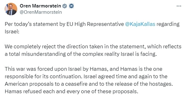 △5月20日,以色列外交部發(fā)言人奧倫·馬莫施泰在社交媒體發(fā)文回應(yīng)歐盟舉措