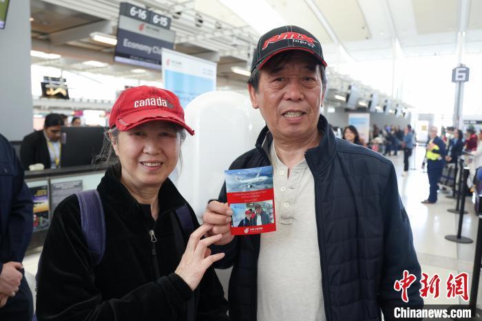 當(dāng)?shù)貢r(shí)間5月20日,旅客姜先生與夫人在多倫多皮爾遜國(guó)際機(jī)場(chǎng)辦理登機(jī)手續(xù)之后拍攝紀(jì)念照片,他們將搭乘CA994航班前往北京。中新社記者 余瑞冬 攝