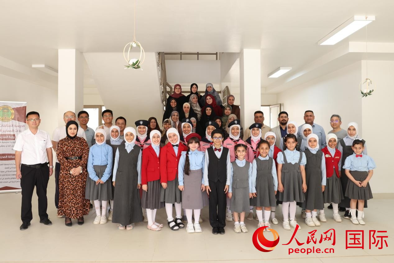 中國(guó)電建員工與阿爾穆塔·阿里卡特國(guó)際學(xué)校的師生及政府官員等合影。人民網(wǎng)記者 薛丹攝