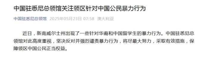 中新網(wǎng)5月23日電 據(jù)中國駐悉尼總領館微信公眾號消息,近日,新南威爾士州出現(xiàn)了一些針對華裔和中國留學生的暴力行為。中國駐悉尼總領館對此高度重視,堅決反對并強烈譴責暴力行為,將盡最大努力,采取有效措施,保障領區(qū)中國公民正當權益。