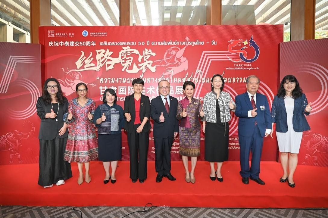 人民網(wǎng)曼谷5月24日電 (記者簡(jiǎn)承淵)當(dāng)?shù)貢r(shí)間23日,“絲路霓裳”甘肅畫(huà)院美術(shù)作品展在曼谷中國(guó)文化中心隆重開(kāi)幕。中國(guó)駐泰國(guó)大使館公使吳志武,泰國(guó)文化促進(jìn)司代理司長(zhǎng)麗畢嘉,甘肅省文化和旅游廳副廳長(zhǎng)龔佳佳,以及泰國(guó)藝術(shù)界知名人士、當(dāng)?shù)匚幕瘷C(jī)構(gòu)代表等嘉賓以及愛(ài)好中國(guó)傳統(tǒng)文化的泰國(guó)觀眾約150人出席活動(dòng)。