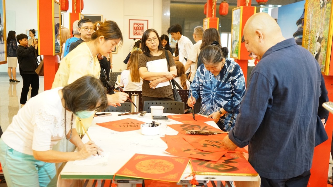 泰國(guó)觀眾學(xué)寫中國(guó)書(shū)法。曼谷中國(guó)文化中心供圖