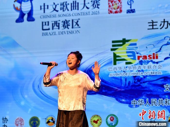 當(dāng)?shù)貢r(shí)間5月25日,巴西圣保羅,2025年“水立方杯”中文歌曲大賽巴西賽區(qū)決賽現(xiàn)場(chǎng),選手邱瑋瑤正在歌唱。中新社記者 林春茵 攝
