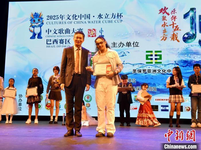 當(dāng)?shù)貢r(shí)間5月25日,巴西圣保羅,2025年“水立方杯”中文歌曲大賽巴西賽區(qū)決賽現(xiàn)場(chǎng),中國(guó)駐圣保羅總領(lǐng)事余鵬(前左)為外籍冠軍選手伊塔洛·阿佐里安頒獎(jiǎng)。中新社記者 林春茵 攝