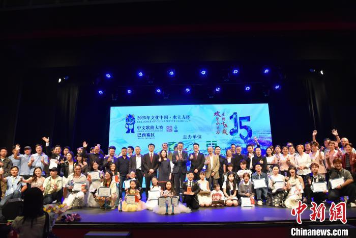 當(dāng)?shù)貢r(shí)間5月25日,巴西圣保羅,2025年“水立方杯”中文歌曲大賽巴西賽區(qū)決賽現(xiàn)場(chǎng),嘉賓、評(píng)委和選手們合影。中新社記者 林春茵 攝