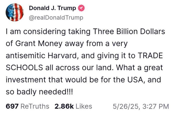 報道稱,特朗普在社交媒體上發(fā)帖稱:“我正在考慮從哈佛大學拿走30億美元的撥款,并將其撥給我們?nèi)珖鞯氐穆殬I(yè)學校?!?/p>