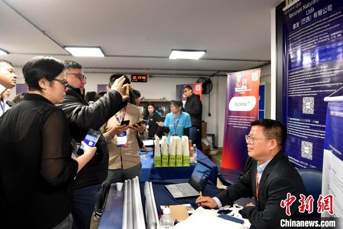 當(dāng)?shù)貢r(shí)間5月31日,巴西圣保羅,求職者在第七屆巴西中資企業(yè)人才招聘會上掃描中企招聘信息二維碼。中新社記者 林春茵 攝