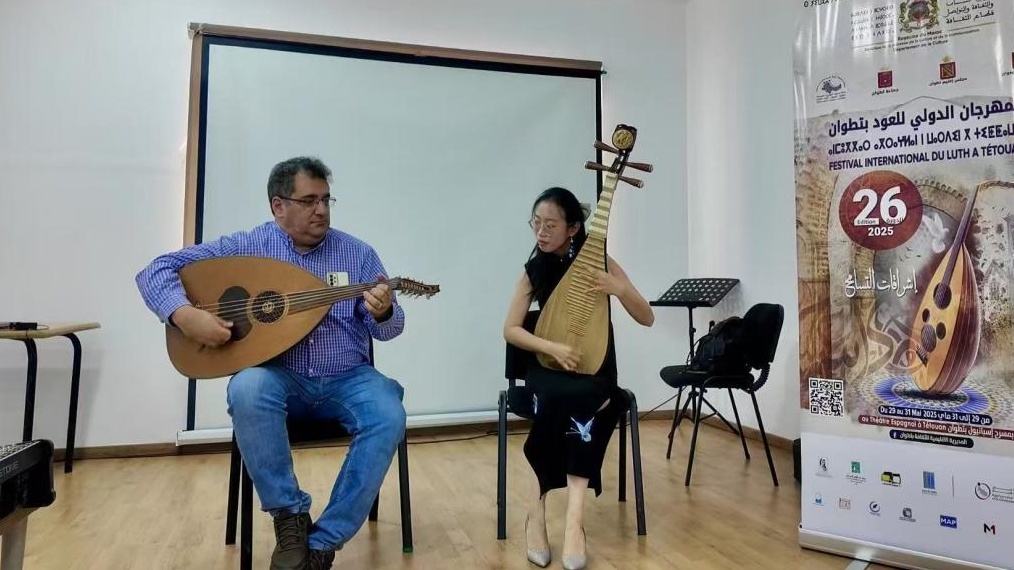 拉巴特中國(guó)文化中心還在得土安音樂(lè)舞蹈藝術(shù)學(xué)院舉辦了以《絲路兩端的弦音交響——琵琶與烏德琴的千年對(duì)話(huà)》為題的“中國(guó)故事”講座。兩位琵琶演奏家結(jié)合現(xiàn)場(chǎng)演示,圍繞中摩兩國(guó)民族樂(lè)器的發(fā)展歷程,深入淺出地講述琵琶與烏德琴之間的文化淵源。摩著名音樂(lè)家、安達(dá)盧西亞音樂(lè)研究員阿明·查丘表示,中國(guó)琵琶演繹方式的多樣性讓人嘆為觀止。隨后,查丘先生即興與中方合奏一曲,為琵琶與烏德琴跨越千年的對(duì)話(huà)留下了最生動(dòng)的當(dāng)代注腳。