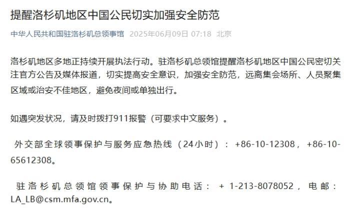 中新網(wǎng)6月9日電 據(jù)中國駐洛杉磯總領(lǐng)事館公眾號9日消息,洛杉磯地區(qū)多地正持續(xù)開展執(zhí)法行動(dòng)。駐洛杉磯總領(lǐng)館提醒洛杉磯地區(qū)中國公民密切關(guān)注官方公告及媒體報(bào)道,切實(shí)提高安全意識(shí),加強(qiáng)安全防范,遠(yuǎn)離集會(huì)場所、人員聚集區(qū)域或治安不佳地區(qū),避免夜間或單獨(dú)出行。