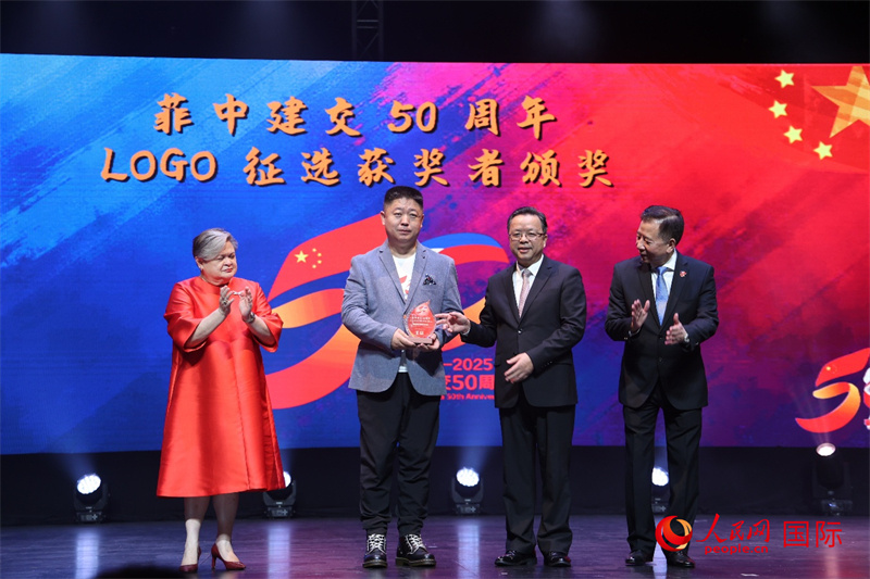 黃溪連和菲外交部候任部長拉扎羅給菲中建交50周年慶?;顒訕?biāo)識設(shè)計獲獎?wù)哳C獎。人民網(wǎng)記者 樊帆攝