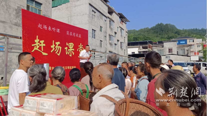 同時,每月逢七的“趕場天”被賦予了新使命。在瓜果時蔬與日用百貨的攤位之間,一片別樣的“知識集市”在攢動的人群中扎下了根——一方簡易講臺、一條鮮亮橫幅“趕場來聽課、實在有收獲”,在“趕場課堂”的臺子上幾位胸前別著黨員徽章的干部正被父老鄉(xiāng)親層層圍攏。