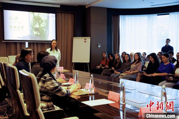 當地時間6月23日,“從茶園到茶港——萬里茶道建筑遺產與茶文化雙主題展”在莫斯科中國貿易中心舉行。圖為與會嘉賓與俄羅斯青年學生對話交流。中新社記者 田冰 攝