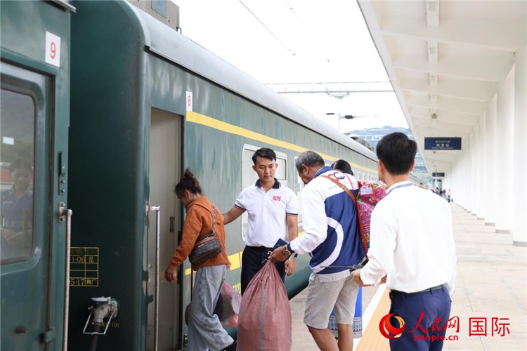 在中老鐵路納磨站,列車員引導(dǎo)旅客有序上車。人民網(wǎng)記者 楊一攝