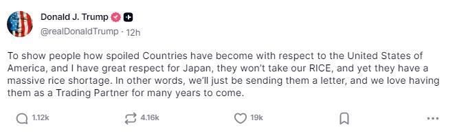 據(jù)報(bào)道,特朗普當(dāng)天在社交媒體上發(fā)文說(shuō),“我對(duì)日本懷有極大的敬意,他們卻不愿進(jìn)口我們的大米,而他們自己正面臨嚴(yán)重的米荒。換句話說(shuō),我們只需要發(fā)一封信(就能解決)。我們?cè)冈谖磥?lái)多年里讓他們繼續(xù)做貿(mào)易伙伴?!?/p>